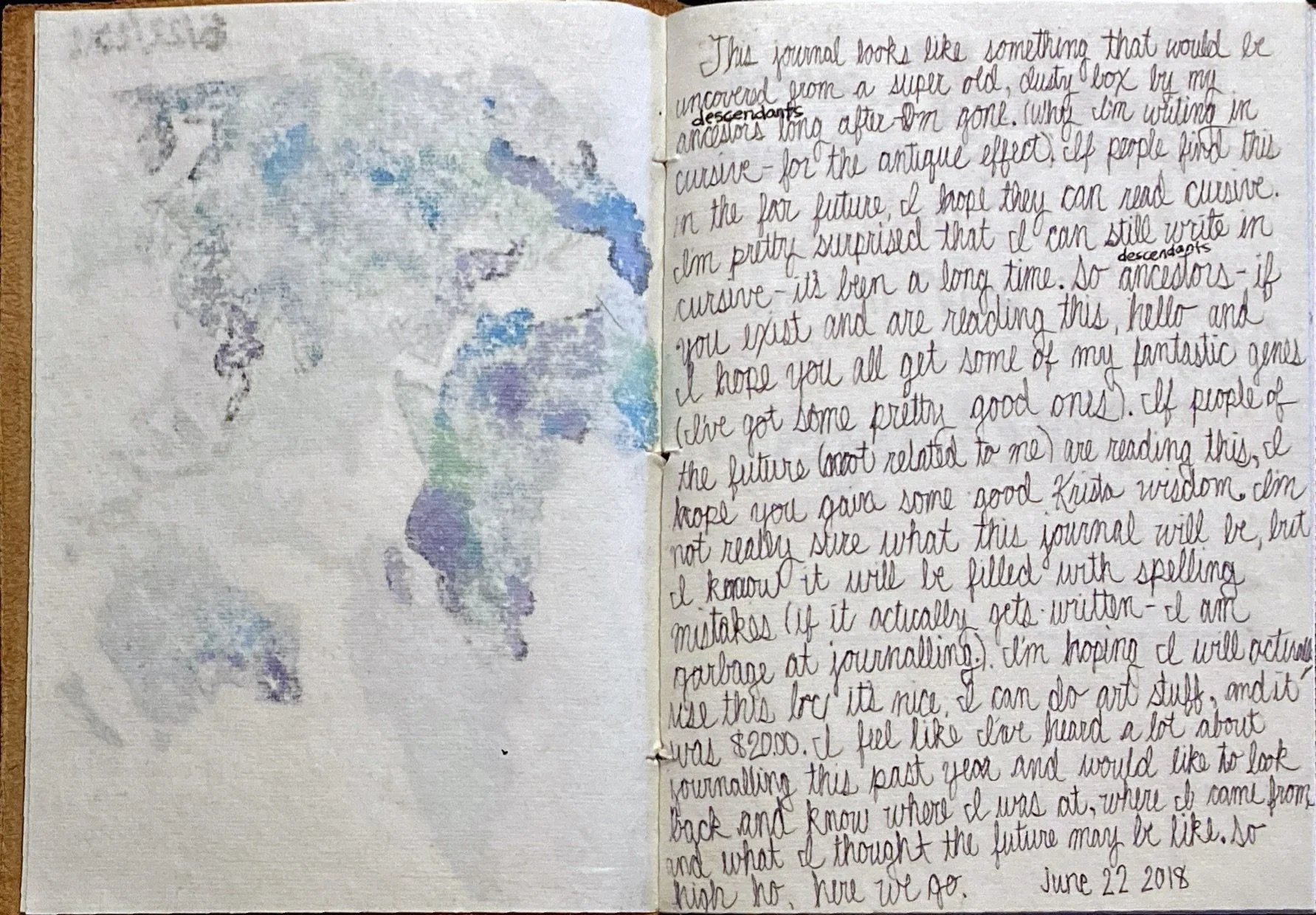 This journal looks like something that would be uncovered from a super old dusty box by my ancestors long after I’m gone. Why I’m writing in cursive - for the antique effect. If people find this in the far future, I hope they can cursive. I’m pretty surprised that I can still write in cursive - it’s been a long time. So ancestors - if you exist and are reading this, hello and I hope you all get some of my fantastic genes (I’ve got some pretty good ones). If people of the future (not related to me) are reading this, I hope you gain some good Krista wisdom. I’m not really sure what this journal will be, but I know it will be filled with spelling mistakes (if it actually get’s written - I am garbage at journalling). I’m hoping I will actually use this because it’s nice. I can do art stuff, and it was $20. I feel like I’ve heard a lot about journalling this past year and would like to look back and know where I was as, where I came from and what I thought the future may be like. So high ho, here we go. June 22, 2018